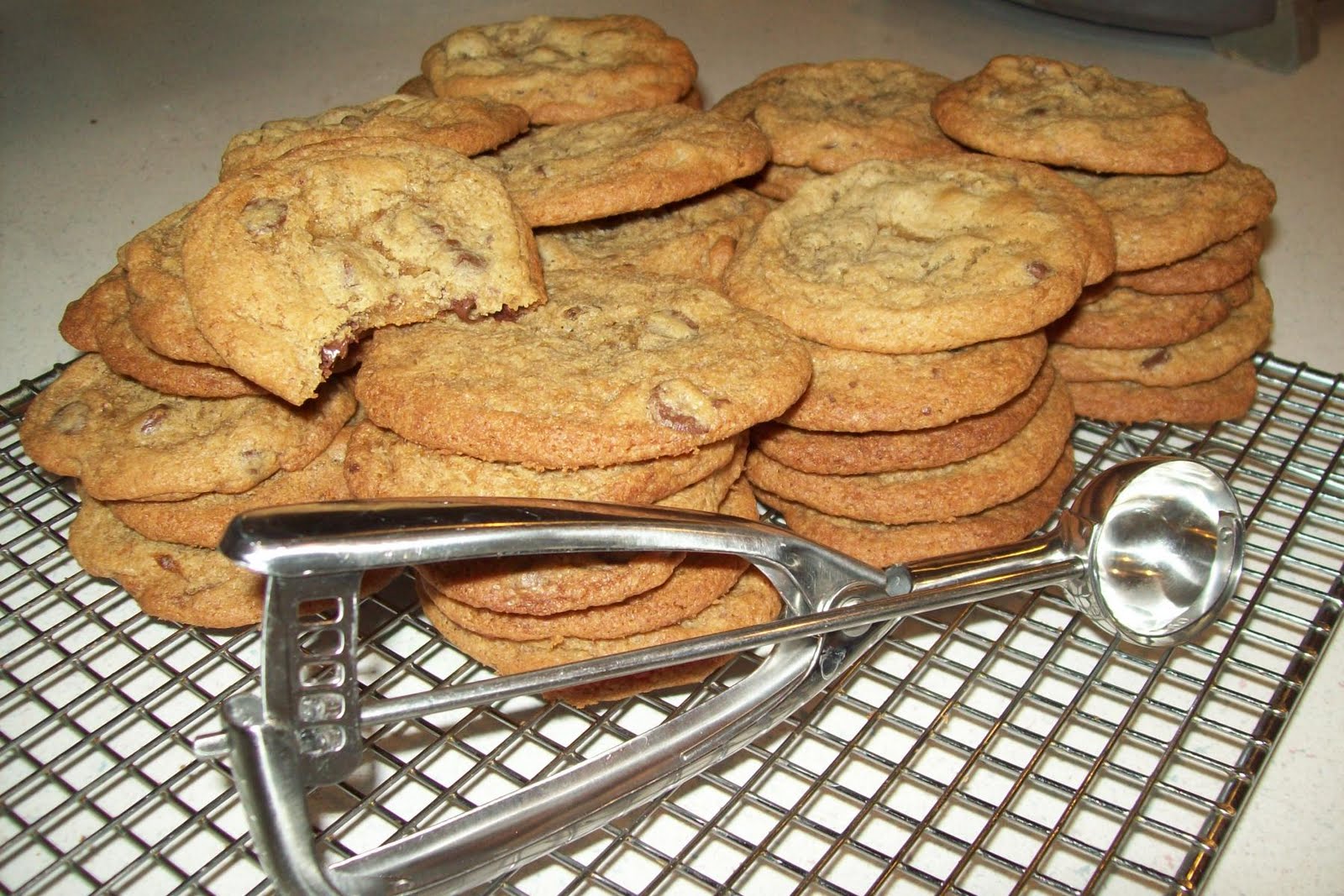 These are very popular at my house. Josh & his friends love my chocolate chip cookies & I usually have them around the house, because they're such an easy treat to have around for them. But they're much easier to make when I have a cookie scoop. Mine broke last year. Without the cookie scoop, I have to use spoons and usually end up with cookie dough all over my fingers. Finally last week, I caved & bought a new cookie scoop. I had forgotten how much easier it was to make cookies with the scoop & how much faster! And how pretty the cookies look when they're all the same size & look so pretty!! Now I remember that I can never go without it!!!